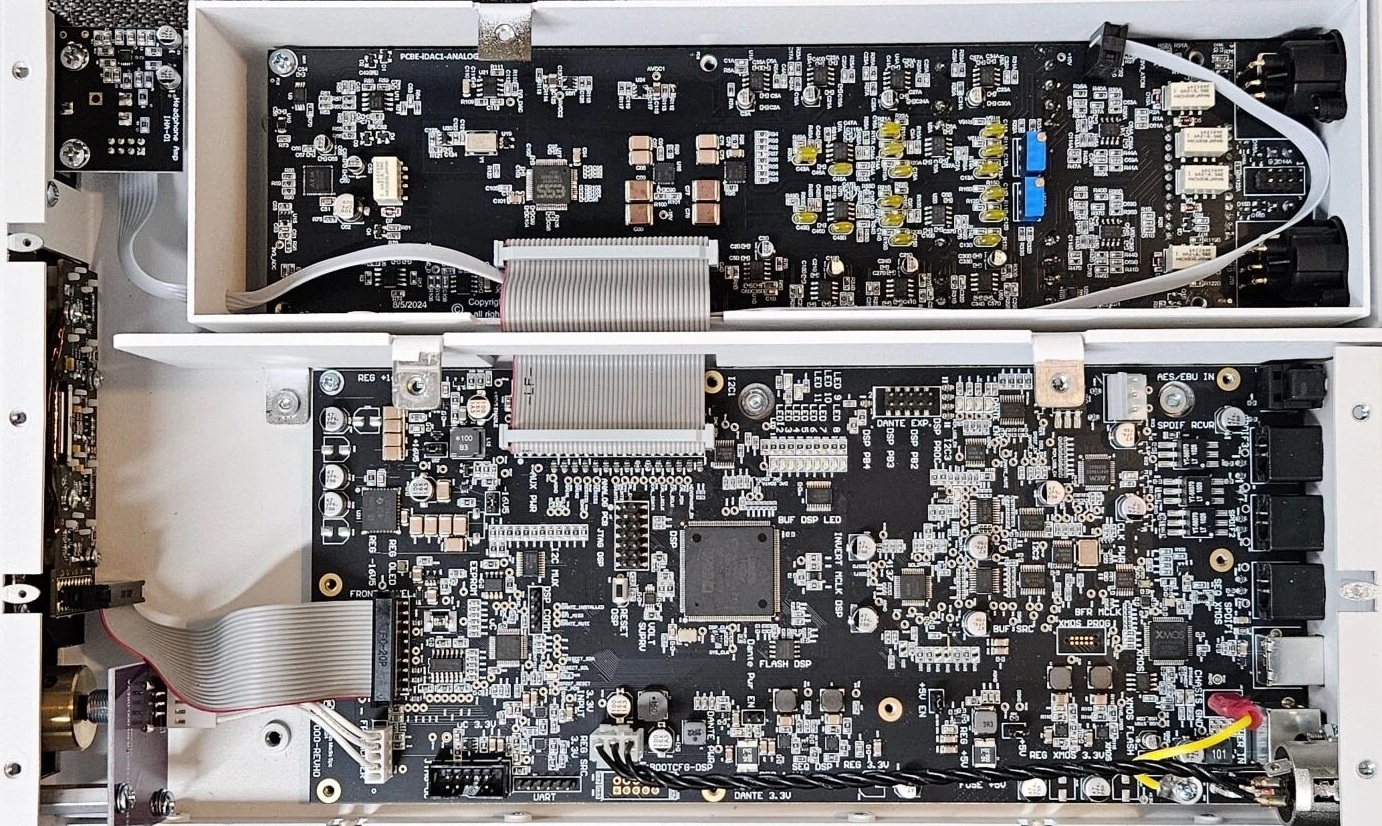 The D-1 is housed in a compact half-rack, 2U chassis with a clean, purposeful industrial aesthetic that reflects its professional lineage. A 10-gauge aluminum plate running the full internal length of the chassis provides RF shielding between the digital and analog PCBs — a physical reminder of just how quiet the analog output section truly is, and a signal to the user to employ the shortest, best-shielded XLR cables available. Multiple digital inputs are provided, with optional expansion cards for Dante and a balanced headphone amplifier available separately.